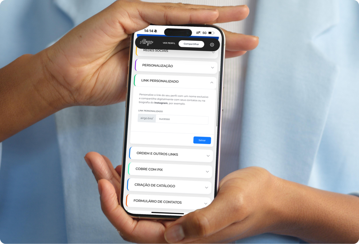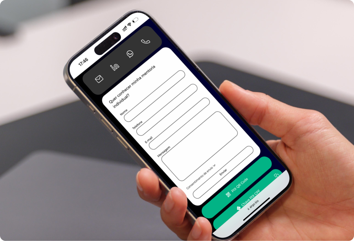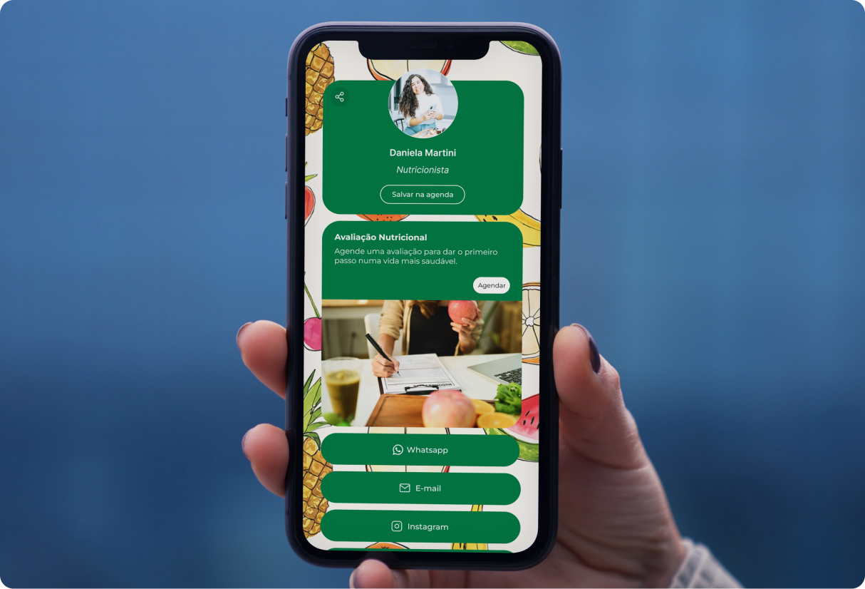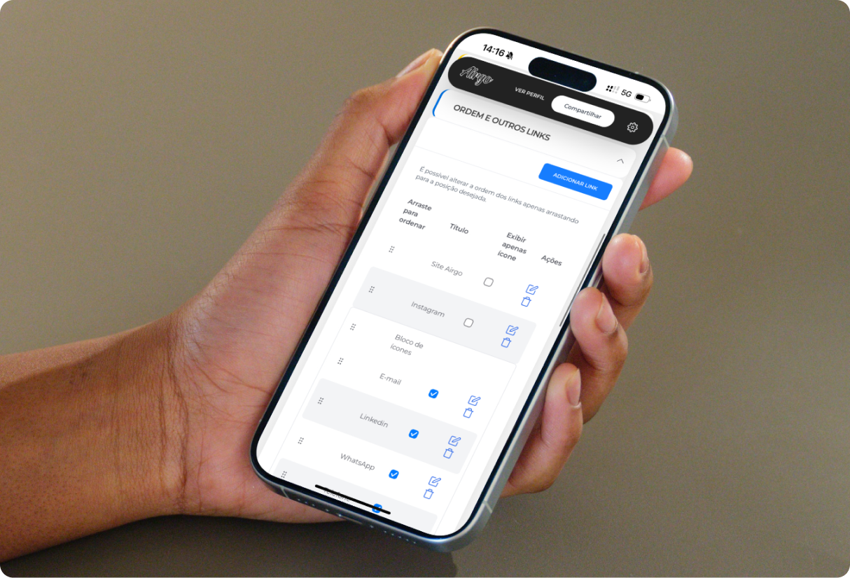 Compartilhe e cadastre quantos links desejar, sejam de redes sociais, sites ou botões de direcionamento. Você pode alterar a ordem dos links conforme sua preferência ou optar por adicionar apenas o ícone representativo em um bloco de ícones. E muito mais!
