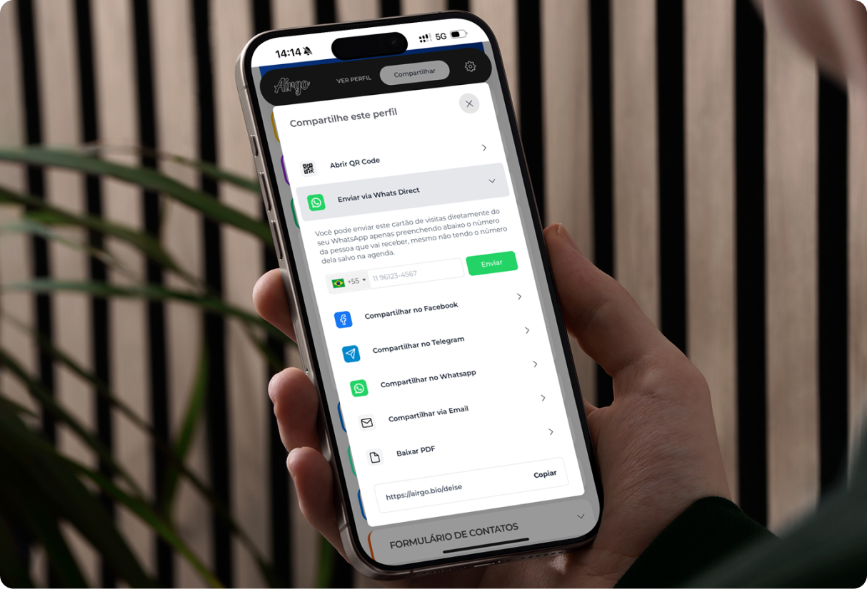 Envie seu cartão Airgo em segundos para um número de WhatsApp mesmo que ele não esteja salvo na sua agenda. Seu cliente fica com seu contato e você com o dele.