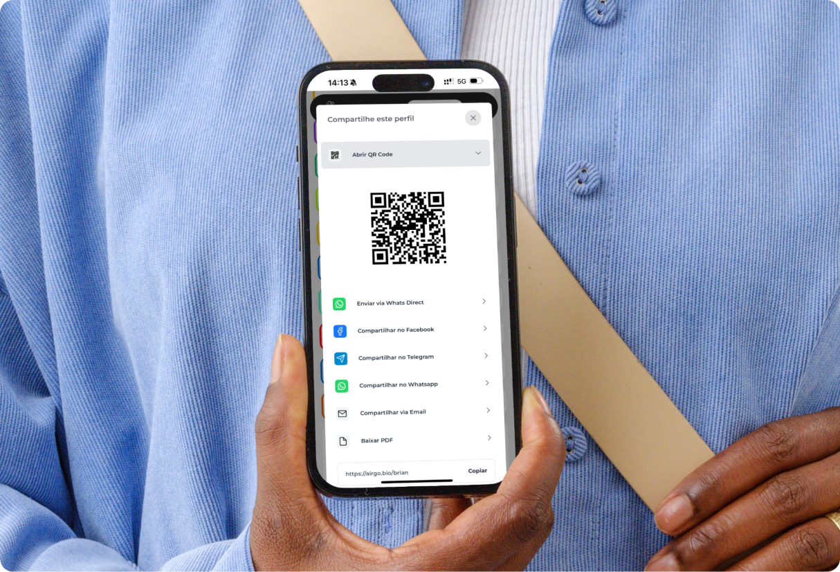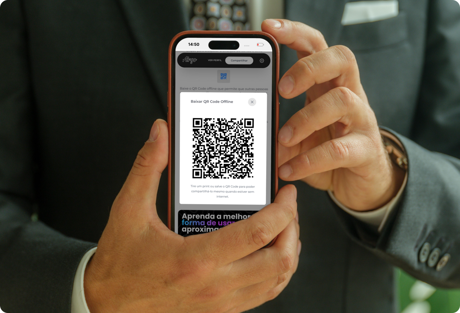 O QR Code offline do Airgo, ao ser lido salva o contato direto na agenda com nome, e-mail, telefone e o link personalizado do seu perfil, funcionando offline em eventos superlotados sem internet ou até no deserto.
