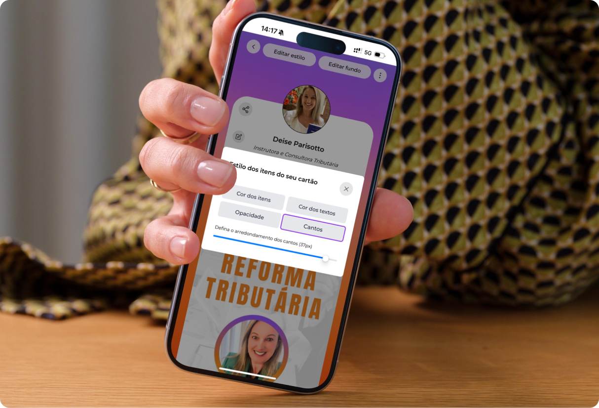 Edite as cores dos itens, escolha uma foto de perfil, crie uma biografia, coloque um plano de fundo, escolha o arredondamento dos itens, a opacidade dos itens e mais...