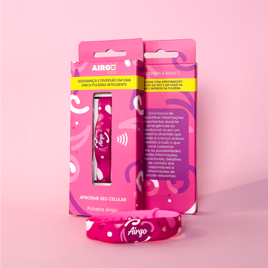 Pulseira inteligente que ao ser escaneada envia a localização, exibe informações médicas, contato dos responsáveis e oferece entretenimento para os pequenos.